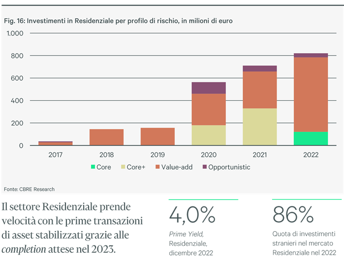 L’ingresso di prodotto stabilizzato sul mercato sosterrà i volumi Gli investimenti nel comparto Residenziale nel 2022 hanno superato gli 6 820 milioni (+13% rispetto al 2021), confermando il forte interesse degli investitori, soprattutto internazionali, per questa asset class.
