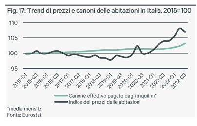 L’opzione della locazione risulta invece più sostenibile: la crescita dei canoni è stata moderata nel 2022 pur incorporando gli aumenti avvenuti nel corso dell’anno causati dalla piena indicizzazione al tasso di inflazione;